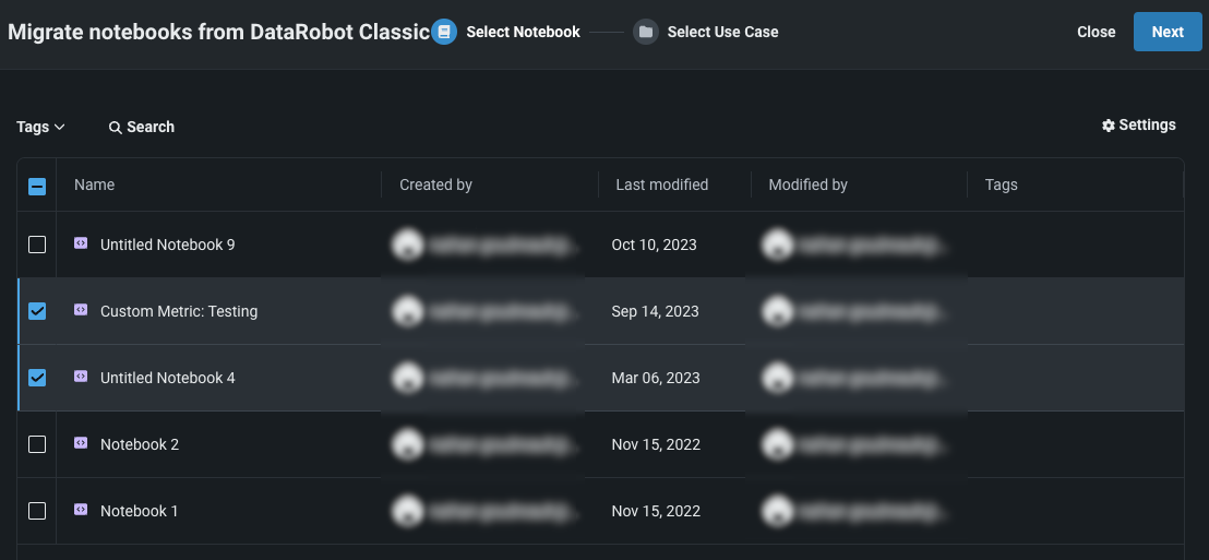 DataRobot lists your DataRobot Classic notebooks available to import. Toggle the checkbox for notebooks you want migrate, then click Next.