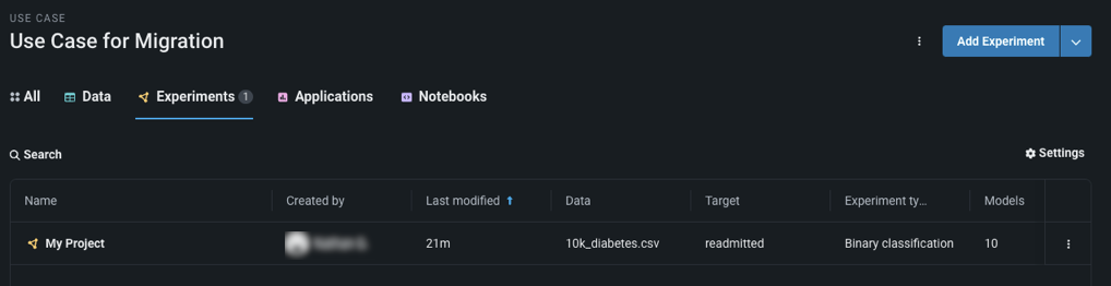 DataRobot takes you to the selected Use Case, where the DataRobot Classic project appears as an experiment within the Use Case.