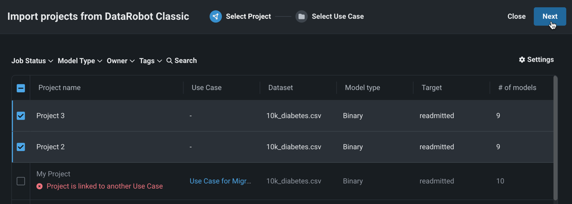 DataRobot lists your DataRobot Classic projects to import, and indicates the projects ineligible for migration. Toggle the checkbox for projects you want migrate, then click Next.