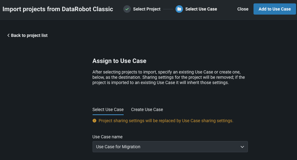 In the proceeding dialog box, choose the Use Case to migrate the project(s) to in Workbench. You can select an existing Use Case, or create a new one (for new Use Cases, you must provide a name and description). Note that the sharing settings for the project will be replace by the Use Case's sharing settings. After selecting a Use Case, click Add to Use Case.