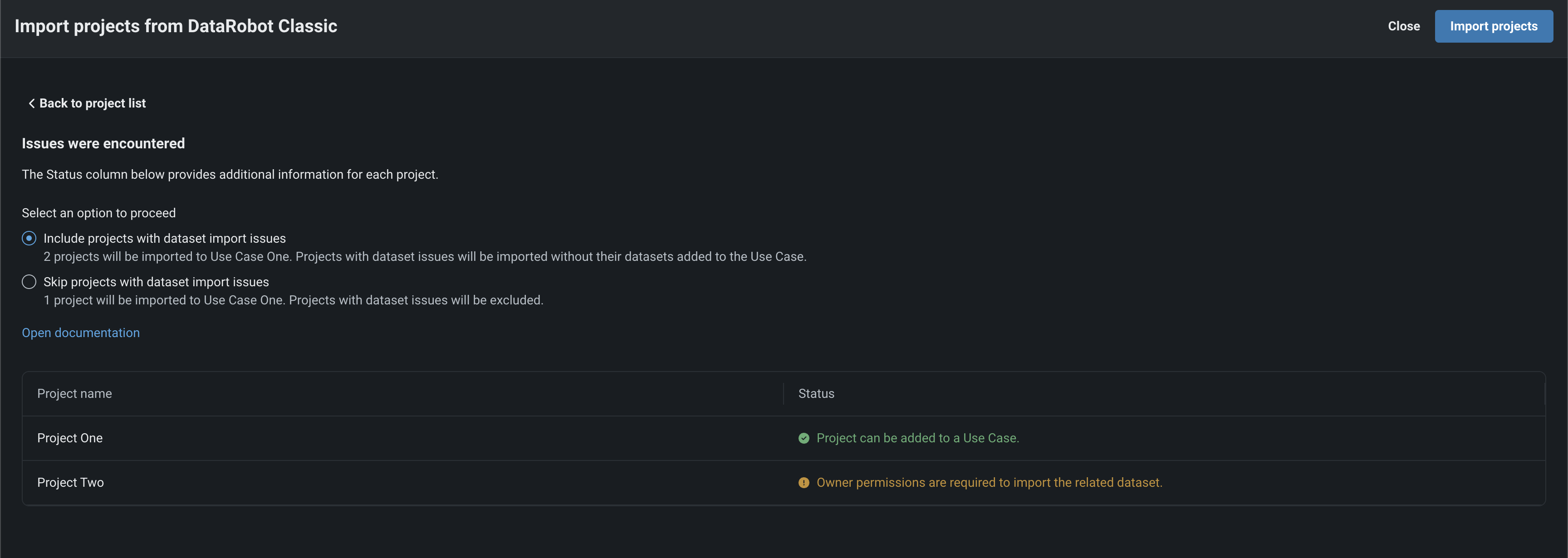 If DataRobot detects issues, a window appears listing each asset with its import status. View the Status column for additional information on why specific assets cannot be migrated. Choose whether to include or skip projects with dataset export issues. Click Import projects.