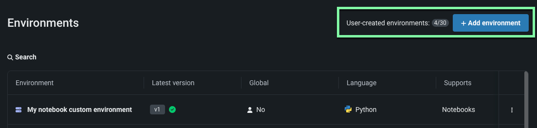 On the Environments page, you can create and access environments for both notebooks and models. To create a new custom environment for a notebook and configure its details, click + Add environment.
