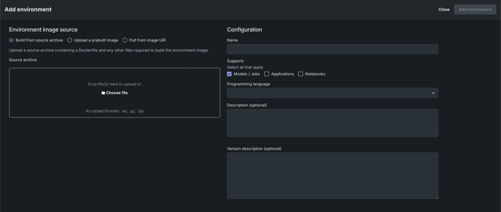 | Prebuilt image | (Optional) A prebuilt environment image saved as a tarball using the Docker save command. |