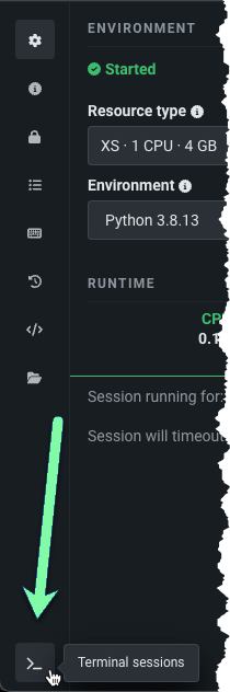 From the sidebar, select the terminal icon at the bottom of the page to create a new terminal window.