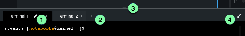| 2 | Add new terminal window | To add an additional terminal session, click the plus sign (+) next to the terminal window name. This will create an additional terminal window as a tab, allowing you to work in multiple windows simultaneously. |