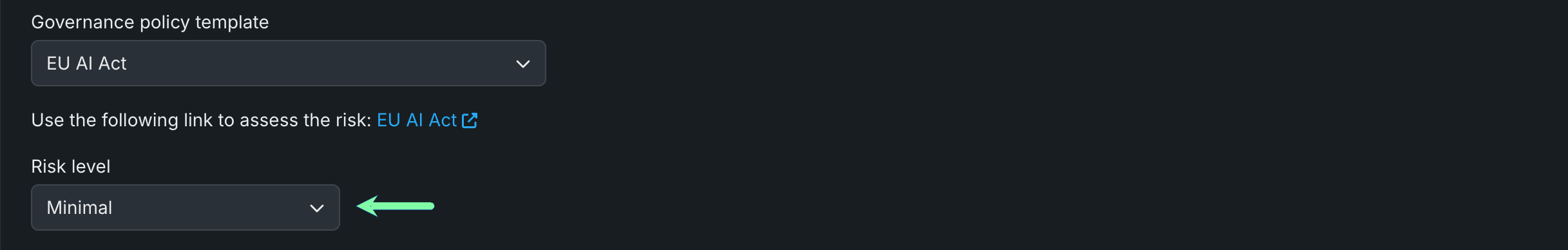 Field Description 1 Name Enter a descriptive name for the governance policy template. 2 Risk levels Add the risk levels associated with this template. To add a risk level, click + Add level. In this example, there are three levels: Minimal, Medium, and High. 3 Risk description Optional. Enter a risk description, for example, any helpful links or information that you want displayed to users when creating future risk assessments. -
