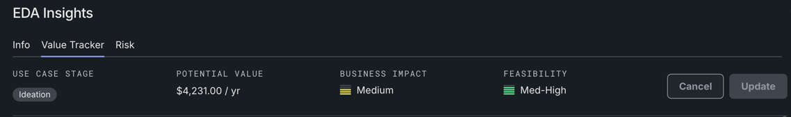 The Value Tracker allows you to specify what you expect to accomplish in a Use Case. You can measure success by defining the value you expect to get and tracking the actual value you receive in real time. The Value Tracker also utilizes Use Case tools to collect the various DataRobot assets you are using to achieve your goals and collaborate with others.
