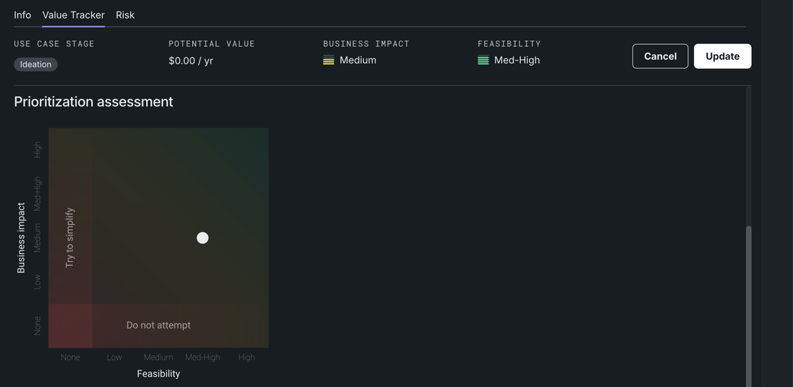 To change a value tracker's location on the grid, click on the desired section and the dot snaps to the closest data point. After making any changes, click Update. These changes are also reflected in Business impact and Feasibility of the summary area.