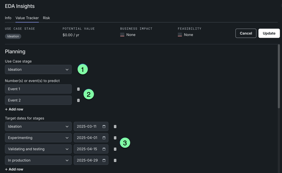 | 3 | Target dates for stages | Dates to indicate when the Use Case is expected to reach individual stages. Select a stage from the dropdown and a date using the calendar picker. Click + Add row to define additional stages. Note that you can only set one target date for each stage. |