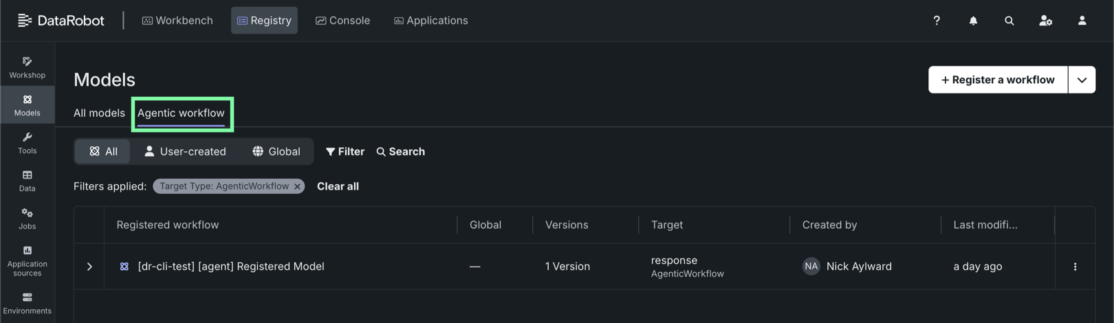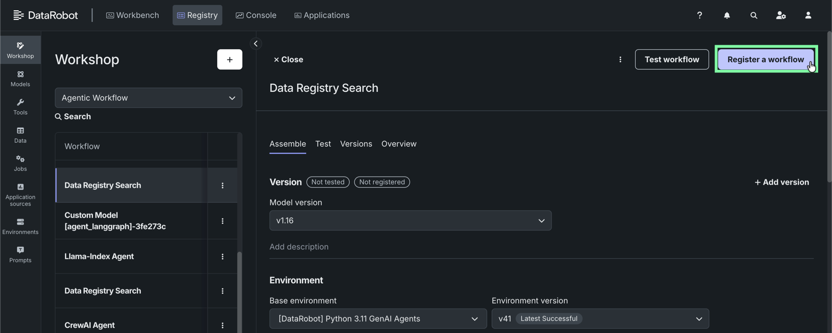 After experimenting in the agentic playground to build a production-ready agentic workflow, register the custom agentic workflow in the Registry workshop, in preparation for deployment to Console.