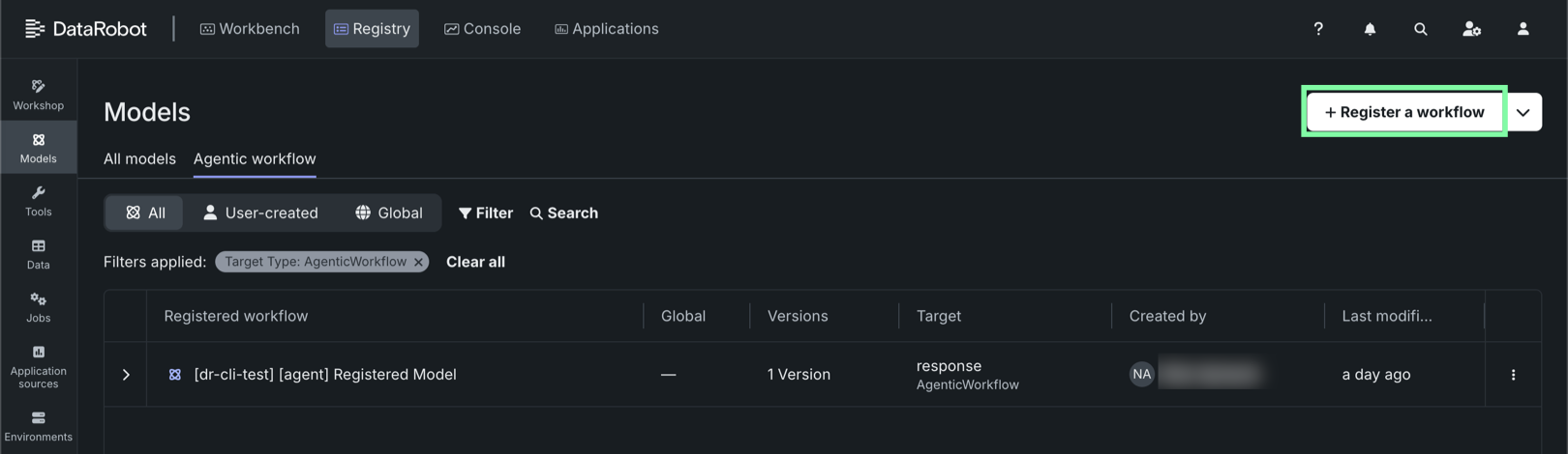 The agentic workflow opens in the Registry Workshop page. Proceed to Register from Workshop.