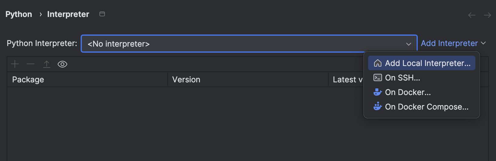 Click the Python Interpreter dropdown (it may show No interpreter) and select Add Interpreter > Add Local Interpreter.