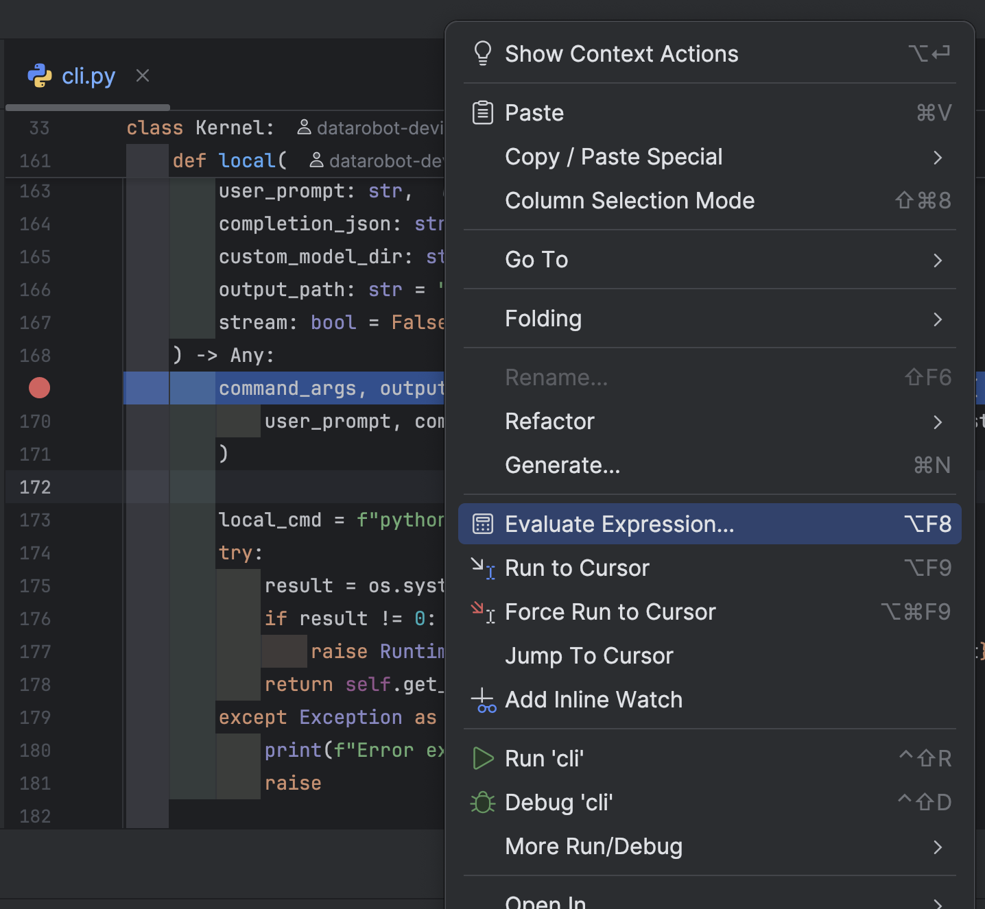 Re-run your CLI command. When execution reaches your breakpoint, PyCharm pauses and opens the Debug tool window so you can inspect state, step through code, and evaluate expressions.