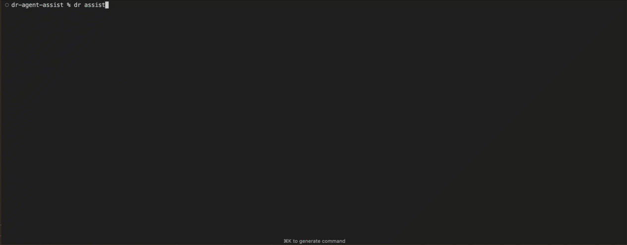 Only run dr assist from a dedicated and empty directory. Running this command in a directory containing code or other files is unsafe. When you use the agent assist coding workflow, the assistant clones the DataRobot Agent Application Template repository into the current directory. This action can overwrite or conflict with existing files, damaging the existing project and degrading the accuracy of the assistant's output. Before running dr assist, if you're not in a dedicated directory, create one and open the terminal there (for example, mkdir my-agent && cd my-agent, then run dr assist).