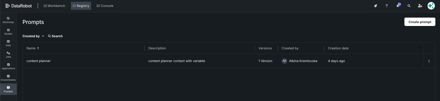 When you click the Prompts tile in Registry, the prompt library opens listing all prompts created by, or shared with, you. You can search for the prompt name or use the Created by filter to search by creator.