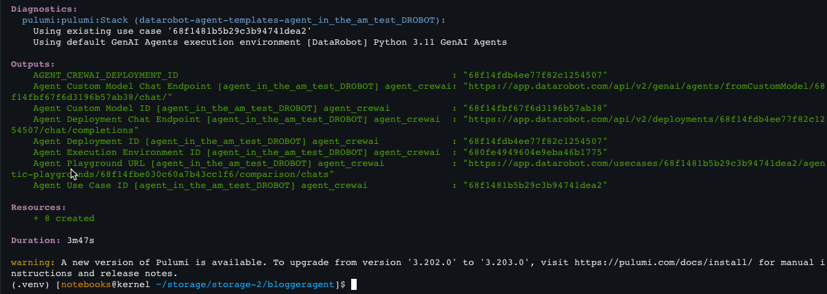 agent_in_the_am_<LASTNAME>, and Enter.(.venv) [notebooks@kernel ~/storage/storage/bloggeragent]$ task deploy Running pulumi up with [DEPLOY] mode Please choose a stack, or create a new one: <create a new stack> Please enter your desired stack name: agent_in_the_am_DROBOT -