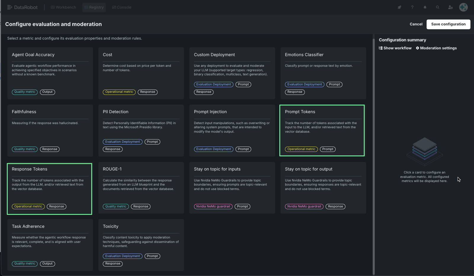 Open and add the Response Tokens metric in the same way. The configuration summary panel shows the newly added metrics.