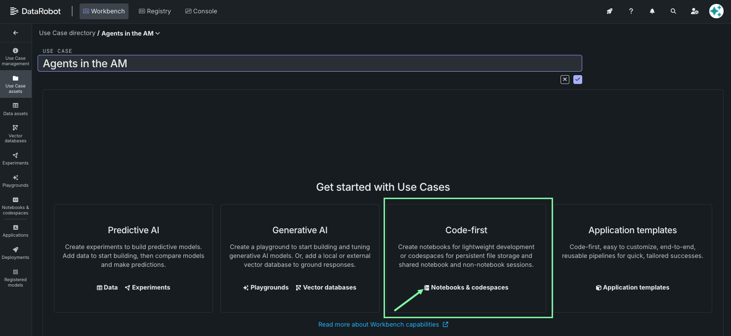 From the Use Case getting started page, navigate to codespaces by clicking Notebooks & codespaces: