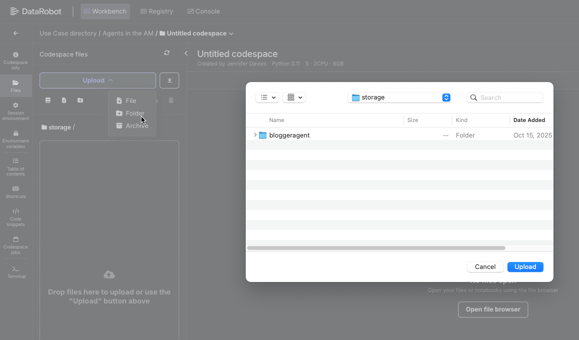 After the session initializes, drag-and-drop the unzipped file folder named bloggeragent, within the storage folder, that was downloaded as part of the prerequisites.
