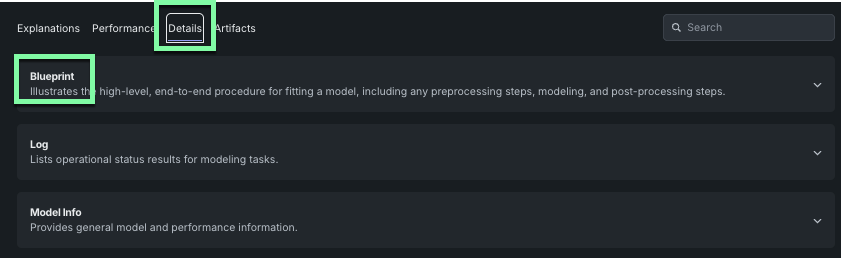 From the model you have selected, click the Details tab and select Blueprint. This allows you to view the pre- and post-processing steps that go into building a model.