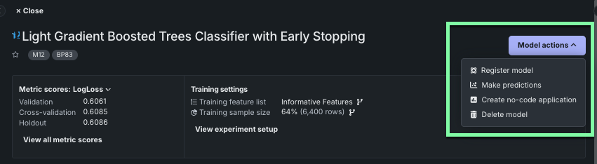 | Make predictions | Make one-time predictions on new data, registered data, or training data to validate Leaderboard models. | Make predictions from Workbench |