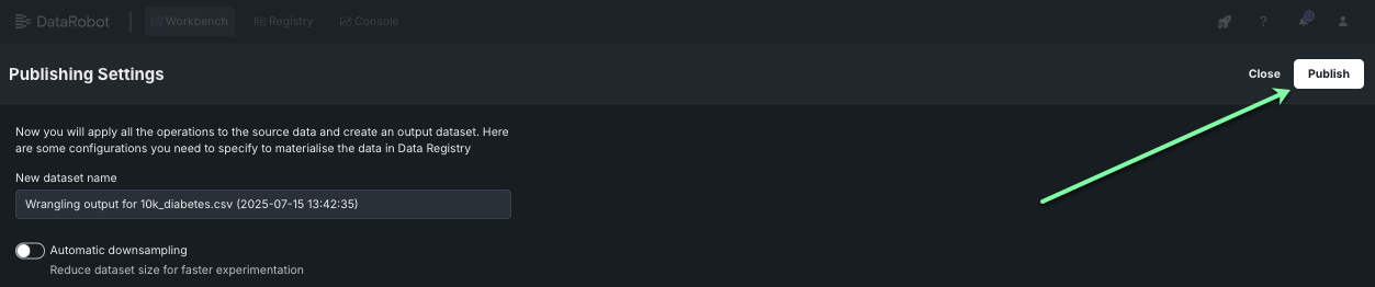 Set the criteria for the final output dataset, such as the name and specifics of automatic downsampling (if enabled). Click Publish to apply the recipe to the source, creating a new output dataset, registering it in the Data Registry, and adding it to your Use Case.