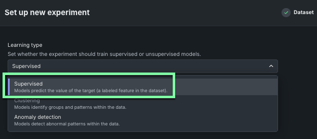 After DataRobot prepares the dataset, you can create a new experiment with the data. First, use the Learning type dropdown to select the type of experiment you want to run, Supervised or Unsupervised (see more about the different learning types in the predictive experiments documentation).