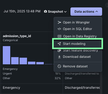 If the dataset needs further modification, you can choose to keep wrangling. Otherwise, from the new output dataset, click Data actions > Start modeling to set up a new experiment.