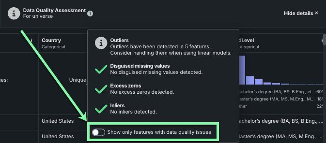 DataRobot performs several functions automatically, including highlighting potential issues with the data. Data quality issues can be isolated by clicking the Show details button.