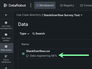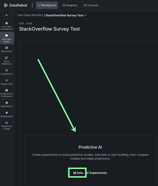 - Log in to DataRobot and click Workbench to access the Use Case directory.