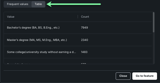 The histogram can be toggled to show a table with more details about each category in the feature by clicking the Table button (indicated below).
