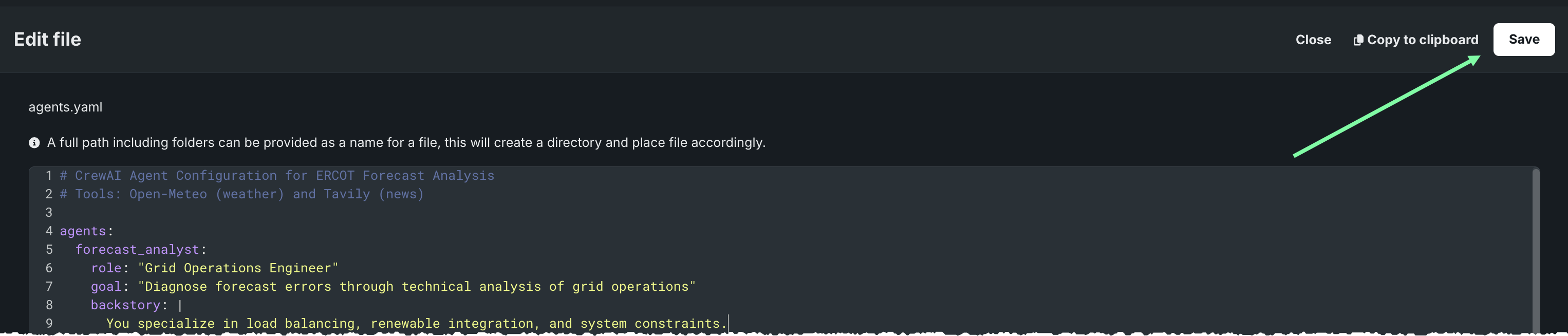 agents.yamlby clicking the pencil icon to the right of the name. All YAML edits will be done here. The structure defines:- Agent identity
