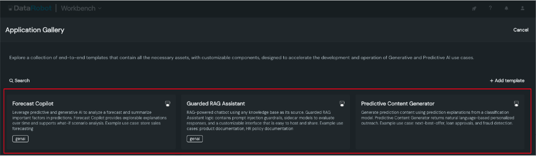 The officially supported templates available in DataRobot are: - Guarded RAG Assistant - Forecast Assistant - Predictive Content Generator - Predictive AI Starter - Talk to My Data Agent - Talk to My Docs Agent