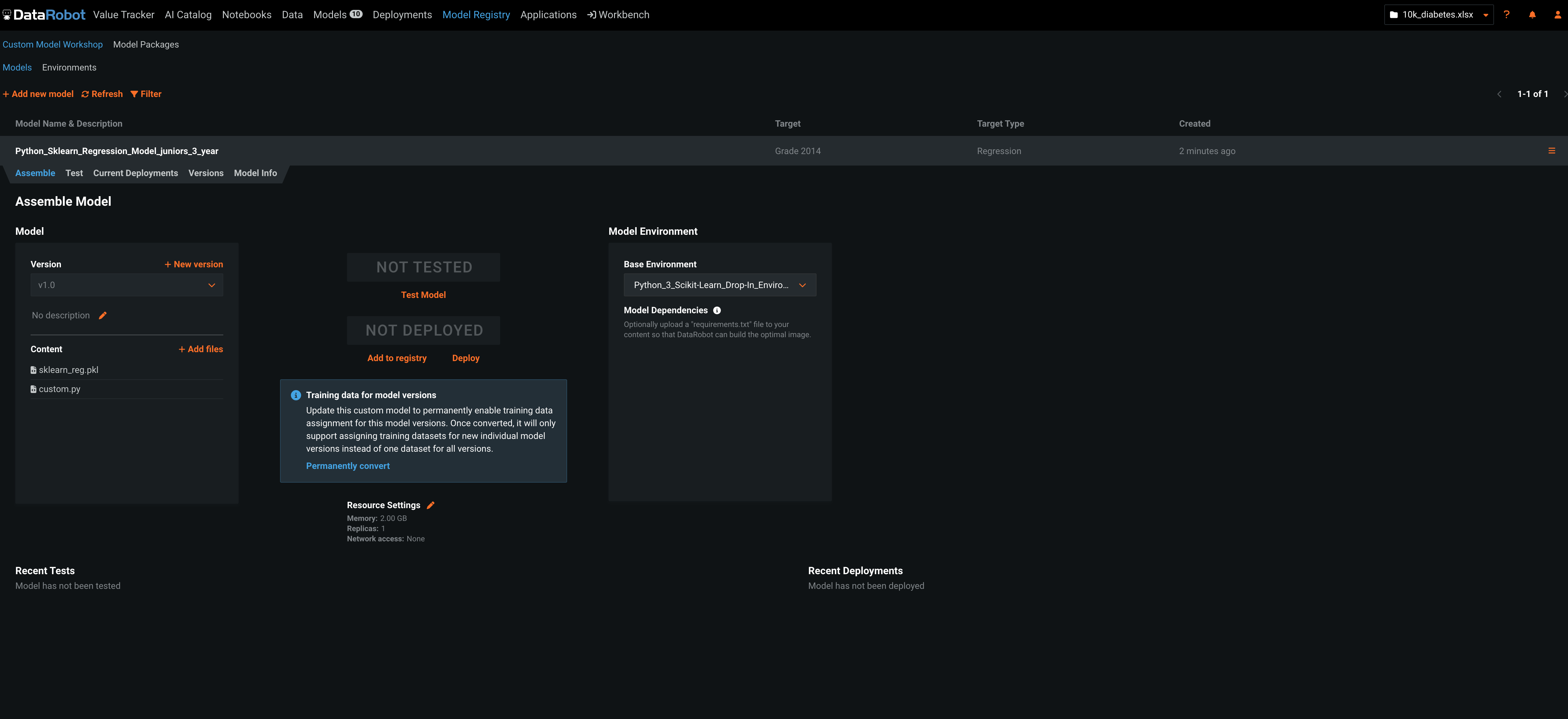 This guide walks you through the process of creating and verifying a custom model in DataRobot, from creating the environment to testing the final deployment.