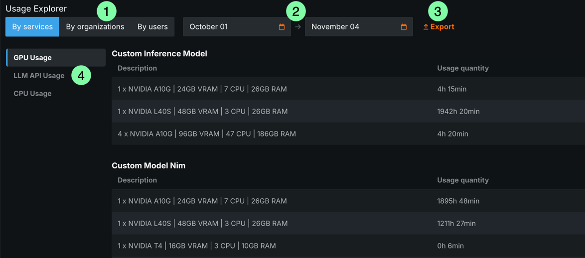 The Usage Explorer provides org admins visibility into the organization's graphics processing unit (GPU), central processing unit (CPU), and large language model (LLM) API usage across the platform, providing general usage information broken down by service or user. Monitoring these resources over time can help indicate whether the organization has the correct number of resources to meet usage needs.