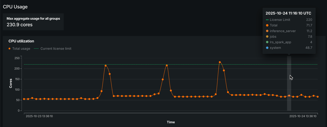 | CPU utilization chart | A chart that displays total usage amount over the specified time period, as well as your organization's current license limit for core usage. Hover to over a point on the chart to view additional information. |