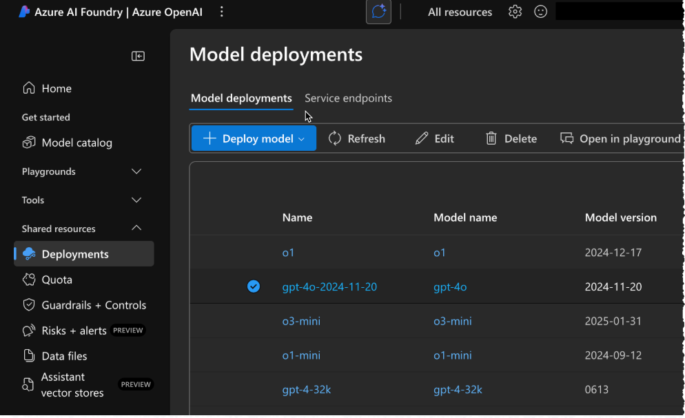For a list of deployment names, see the chat model ID on the Azure OpenAI LLM availability page.
