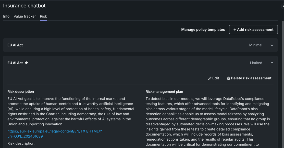 On the Risk tab, you can identify potential risks to the Use Case, and then determine how you plan to address and mitigate those risks using DataRobot risk management tools. Risk includes anything that may impact the Use Case, including legal, operational, IT security, strategic, bias and fairness, and more. Because risk is always changing, risk assessments need to be updated and/or created periodically.
