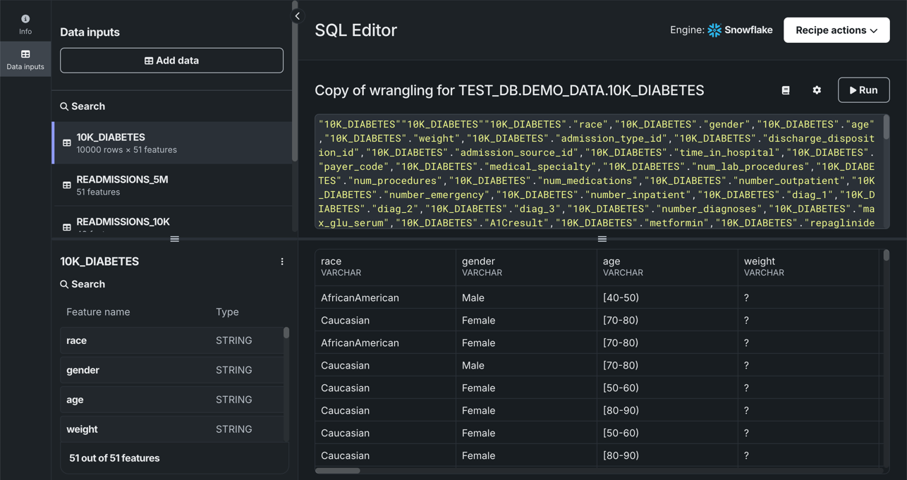 Use the SQL Editor in Workbench to create recipes comprised of SQL queries that enrich, transform, shape, and blend datasets together to create a new output dataset. To open the SQL Editor, in the Data assets tile of your Use Case, open the actions menu next to a dataset and select Open in SQL Editor. To enrich your primary dataset, you can add data inputs from the same data engine as the original dataset, and once you've added data inputs, you can begin adding SQL queries to the editor. When the query is complete, click Run to preview the results.