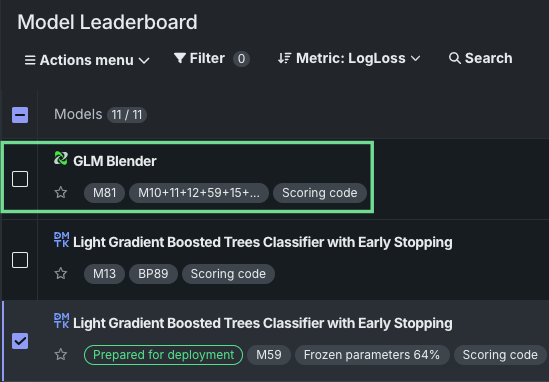 Select from two to eight models from the Leaderboard’s Actions menu, select a blend method, and train the new model. When training is complete, the new blended model displays in the list on the Leaderboard.