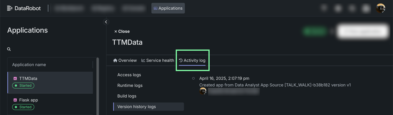 DataRobot records the following activity logs for custom applications: