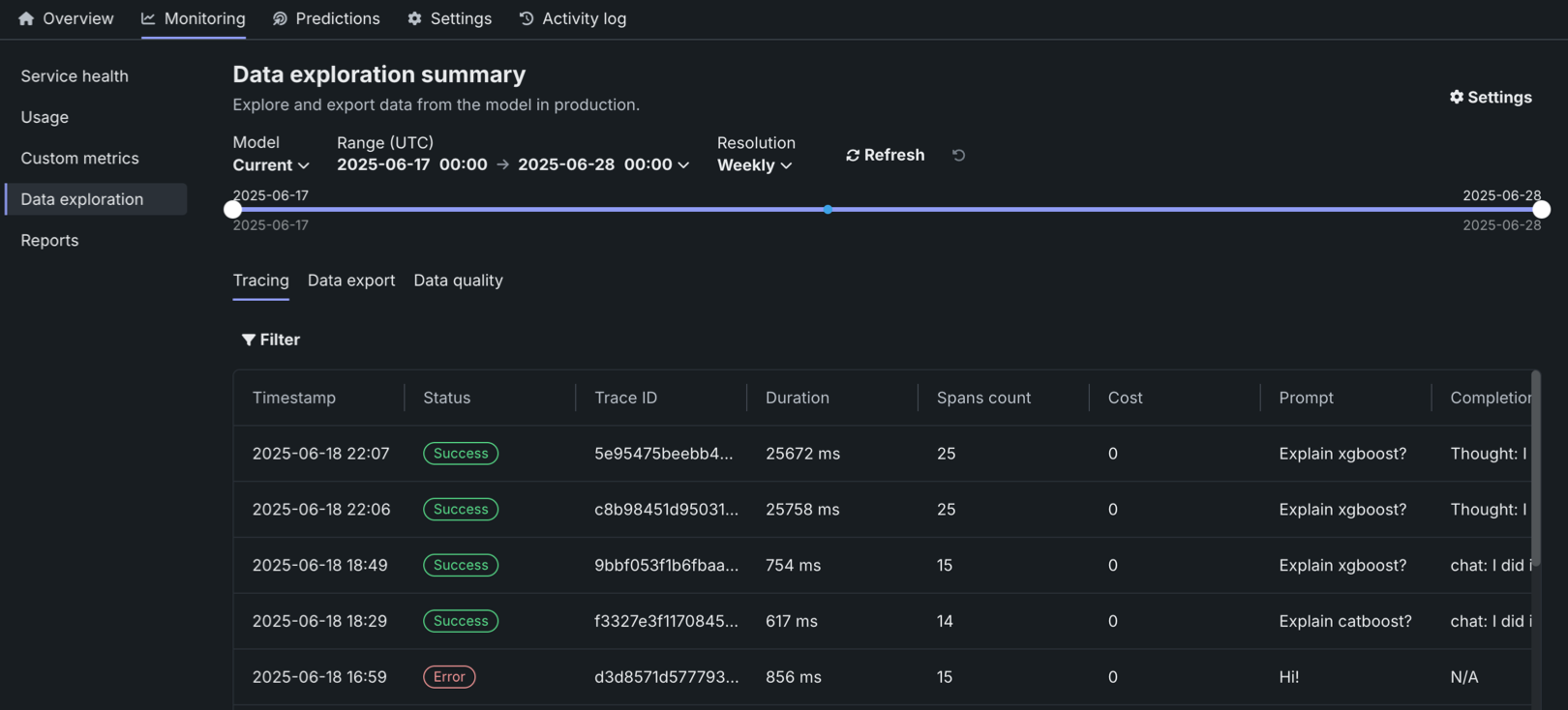 On the Data exploration tab of a custom or external model deployment, click Tracing to explore traces from the model or agentic workflow. Each trace—identified by a timestamp and a trace ID—contains a visual timeline that represents actions carried out by the model or agent, and revealing the order and duration of these actions.