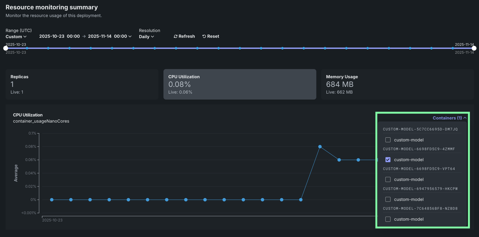The Monitoring > Resource monitoring tab provides visibility into resource utilization metrics for deployed custom models and agentic workflows, helping you monitor performance, identify bottlenecks, and understand auto-scaling behavior. Use this tab to evaluate resource usage, navigate tradeoffs between speed and cost, and ensure your deployments efficiently utilize available hardware resources.
