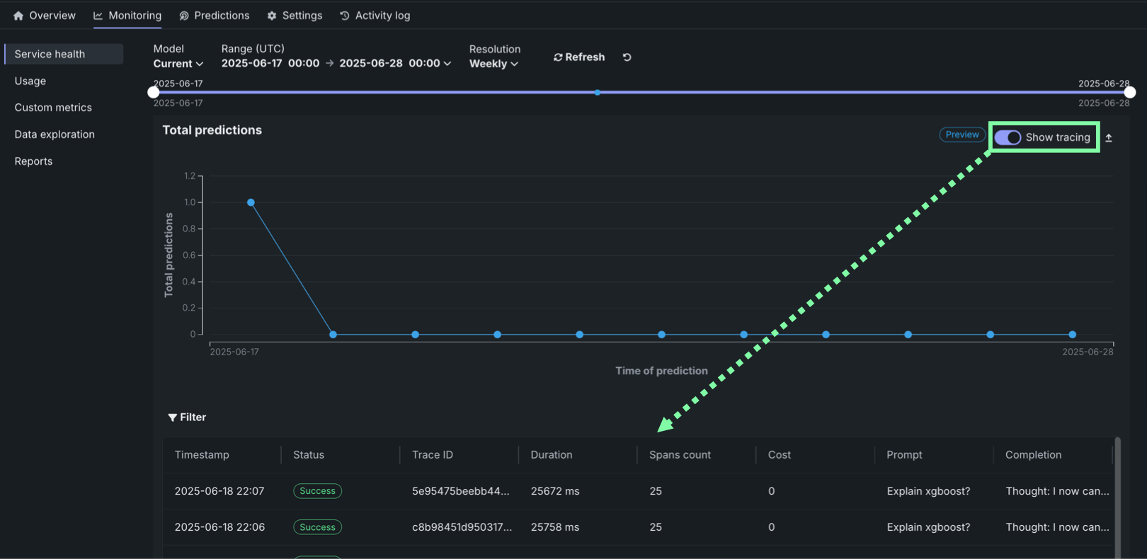 On the Service health tab of a custom or external model deployment, you can view the tracing table below the Total predictions chart. To view the tracing table, in the upper-right corner of the Total predictions chart, click Show tracing.