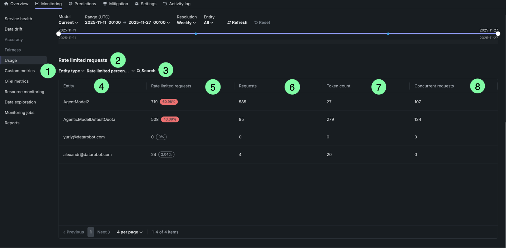 | 8 | Concurrent requests column | Displays the number of requests that were rate limited due to exceeding the concurrent requests quota. |