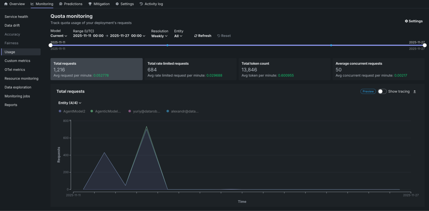 On the Monitoring > Usage tab for agentic workflow and NIM (NVIDIA Inference Microservices) deployments, the Quota monitoring dashboard visualizes the historical usage of an agentic workflow or NIM deployment segmented by user or agent.