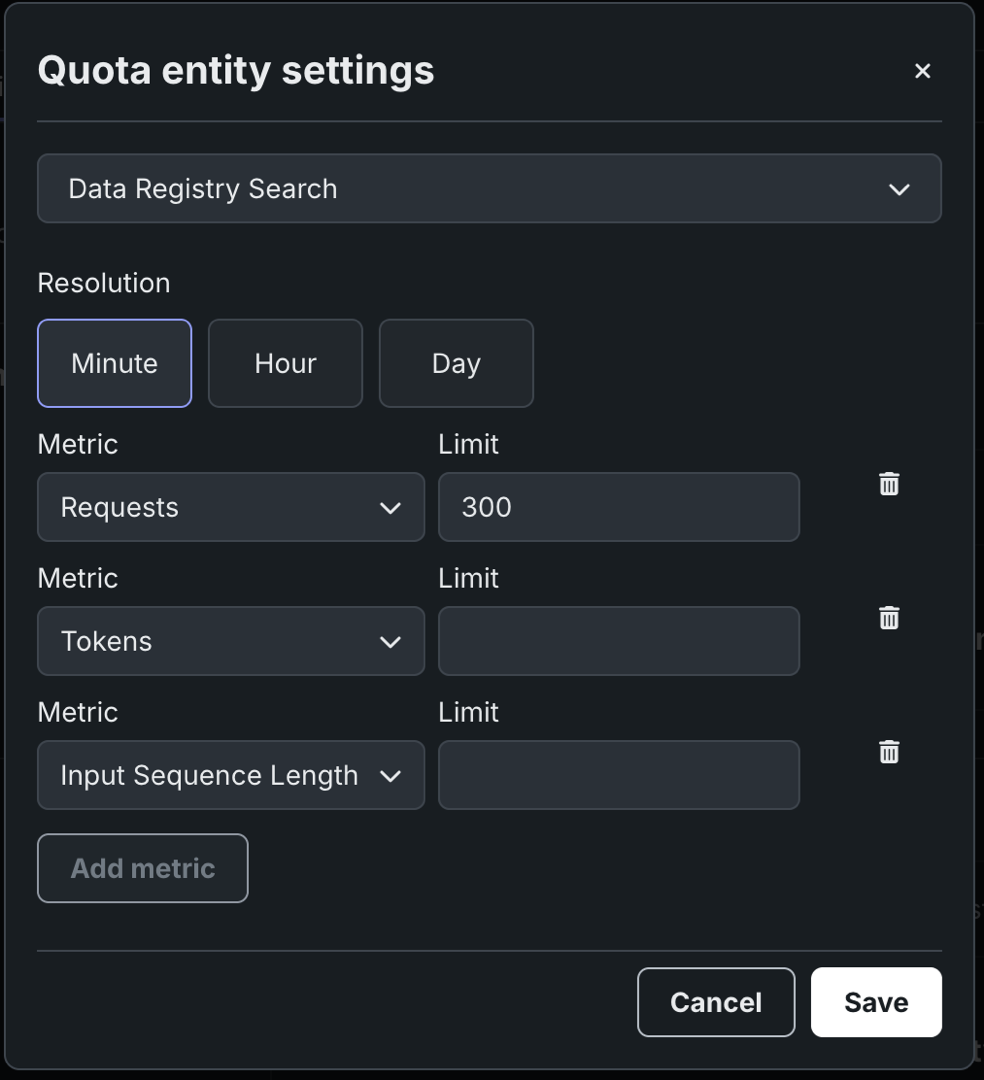 In the new quota row, select a Metric and enter a Limit. The quota settings allow defining limits on three key metrics: