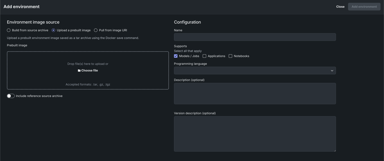 | Upload a prebuilt image | Provide a prebuilt environment image saved as a tarball using the Docker save command. Optionally, you can also click Include reference source archive to upload the source archive used to build the image for reference purposes. This source archive is not used to build the environment. |