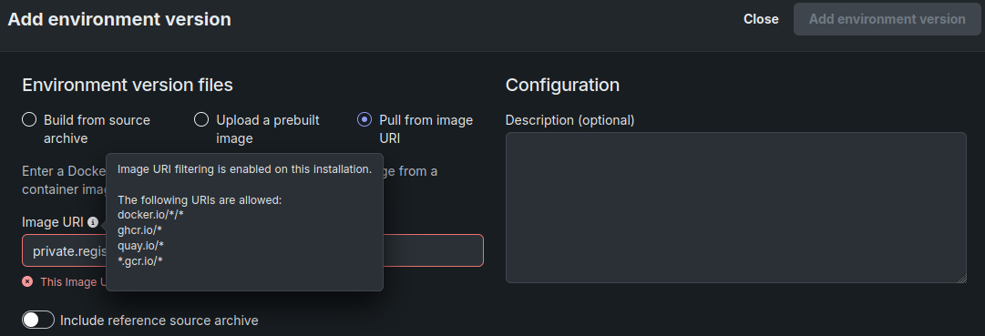 When adding an environment as an image URI, URI filtering allows only the URIs defined for your organization. If the URI you provide isn't allowed, a warning appears as helper text under the Image URI field. Hover over the helper text to view the URI filtering details. URI filtering is not enforced for API administrators.