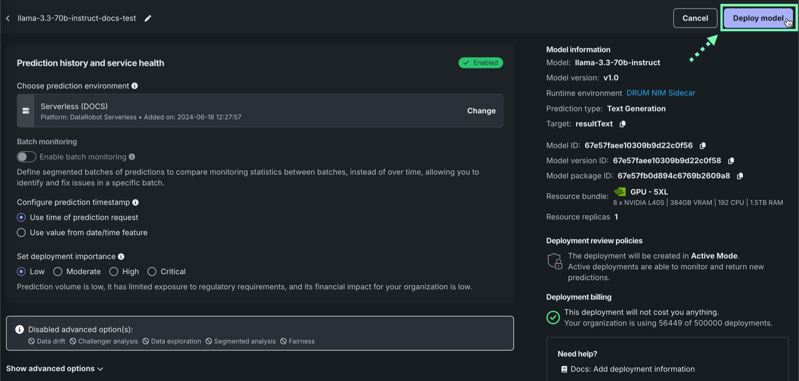 After the NVIDIA NIM is registered, deploy it to a DataRobot Serverless prediction environment.
